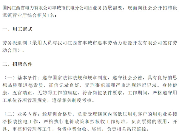國網(wǎng)江西省電力有限公司豐城市供電分公司因業(yè)務(wù)拓展需要,現(xiàn)面向社會公開招聘段潭鎮(zhèn)營業(yè)廳綜合柜員1名:一、用工形式勞務(wù)派遣制(錄用人員與我司江西省豐城市惠豐勞動(dòng)力資源開發(fā)有限公司簽訂勞動(dòng)合同)。二、招聘條件(一)基本條件:遵守國家法律法規(guī)和規(guī)章制度,遵守社會公德,...